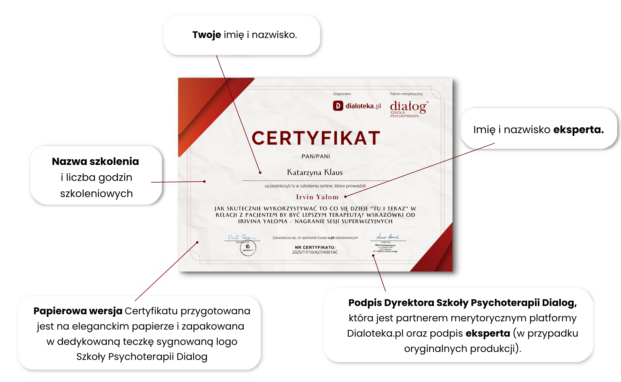 Certyfikat ze szkoleń Szkoły Psychoterapii Dialog: